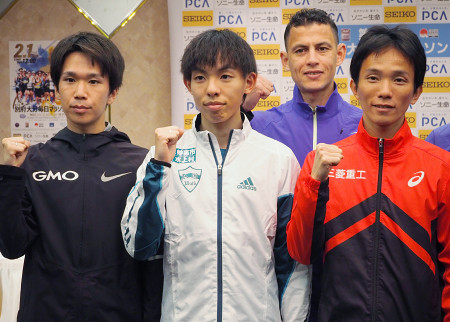 別府大分毎日マラソン(2月1日)を控え、有力選手が1月31日に大分市内で記者会見した。写真はポーズを取る(前列左から)吉田祐也、黒田朝日、井上大仁。 【時事通信社】