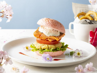 富士マリオットホテル山中湖(山中湖村)が3月1日、季節限定メニュー「甲斐(かい)サーモンとフィッシュケーキの春色バーガー」の販売を始める。