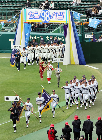 第98回選抜高校野球大会は19日、兵庫県西宮市の阪神甲子園球場で開会式が行われ、開幕した。写真は入場行進する、春連覇を目指す横浜の選手(手前)ら。 【時事通信社】