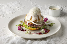 富士マリオットホテル山中湖(山梨県山中湖村)が12月1日、季節限定メニュー「リンゴンベリーの雪富士バーガー」の販売を始める。