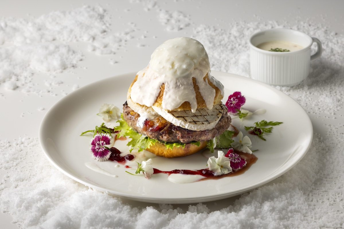 地域食材を使ったハンバーガーを毎年季節に合わせて考案している同ホテル。雪化粧をまとった富士山を表現した同商品は、モッツァレラチーズを載せた富士山型のブリオッシュバンズに、山梨県産ブランド牛「甲州ワインビーフ」のパティ、2枚重ねのカマンベールチーズ、リンゴンベリージャム、ヨーグルトソースを材料に使う。セットにクラムチャウダーを用意する。価格は4,000円。