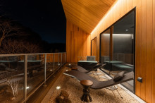 富士北麓の湧水を使ったサウナ、露天風呂、内風呂も用意。サウナはバルコニーに直結し、外気浴が楽しめる造りとなっている。