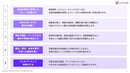 ALTILANでは「ストーリードリブンの宇宙ビジネス開発」というアプローチを定義・推進しています。これは、宇宙ビジネスの創出にいきなり本格投資するのではなく、企業の本質的な価値や歴史を起点に、宇宙へ挑戦する理由を漸次的に構築していくアプローチです。企業が培ってきた想い、大切にしてきた価値観、独自の強みを丁寧に紐解き、それが宇宙という舞台でどのように活かされ、どのような未来を実現するのかを物語として描き出します。