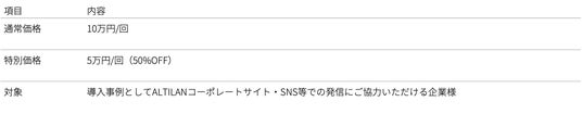 さらに、本サービスの本格始動を記念し、先着3社限定で通常10万円の勉強会を半額の5万円にてご提供いたします(導入事例としてALTILANコーポレートサイト・SNS等での発信にご協力いただける企業様が対象です)。