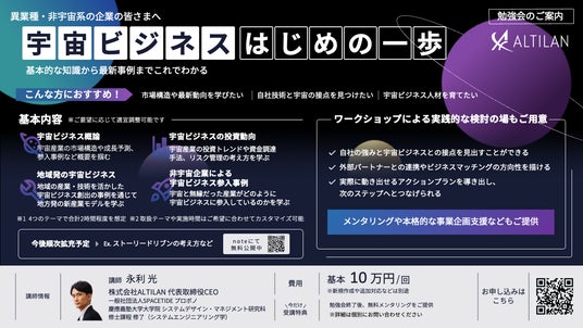 誰もが宇宙へ行ける時代の世界観を描き、文化の創造から宇宙ビジネスの共創まで一貫して推進する株式会社ALTILAN(本社:静岡県浜松市、代表取締役CEO:永利光、以下、ALTILAN)は、宇宙ビジネスにご関心をお持ちの異業種企業を対象とした勉強会「宇宙ビジネスはじめの一歩」の提供を本格的に開始いたします。