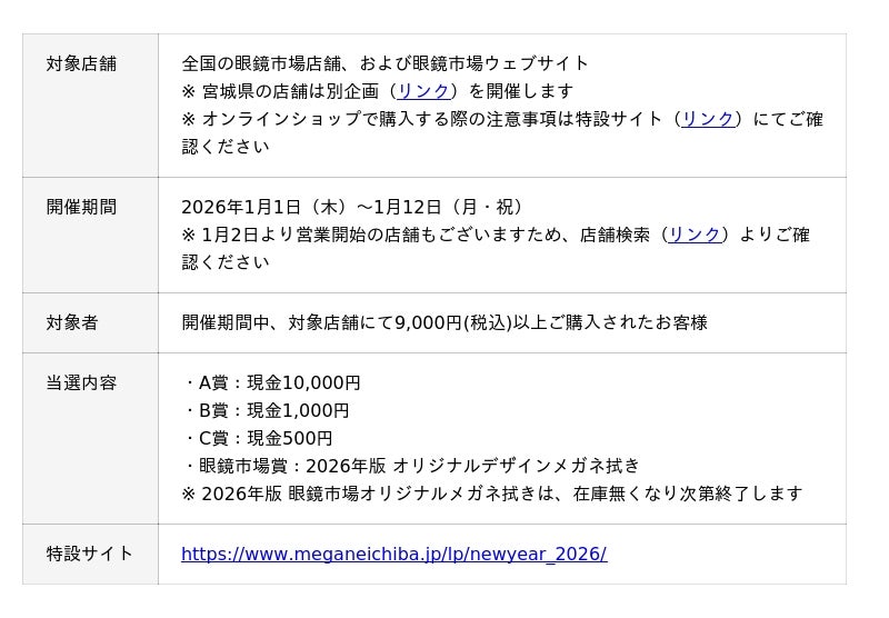 全国に「眼鏡市場」を展開する株式会社メガネトップ(本社:静岡県静岡市、代表取締役社長:冨澤昌宏、以下「眼鏡市場」)は、2026年1月1日(木)~12日(月・祝)の期間中、全国の眼鏡市場店舗、および眼鏡市場オンラインショップで9,000円(税込)以上ご購入されたお客様を対象に、抽選で現金10,000円が当たる『メガ得初売2026』を開催します。