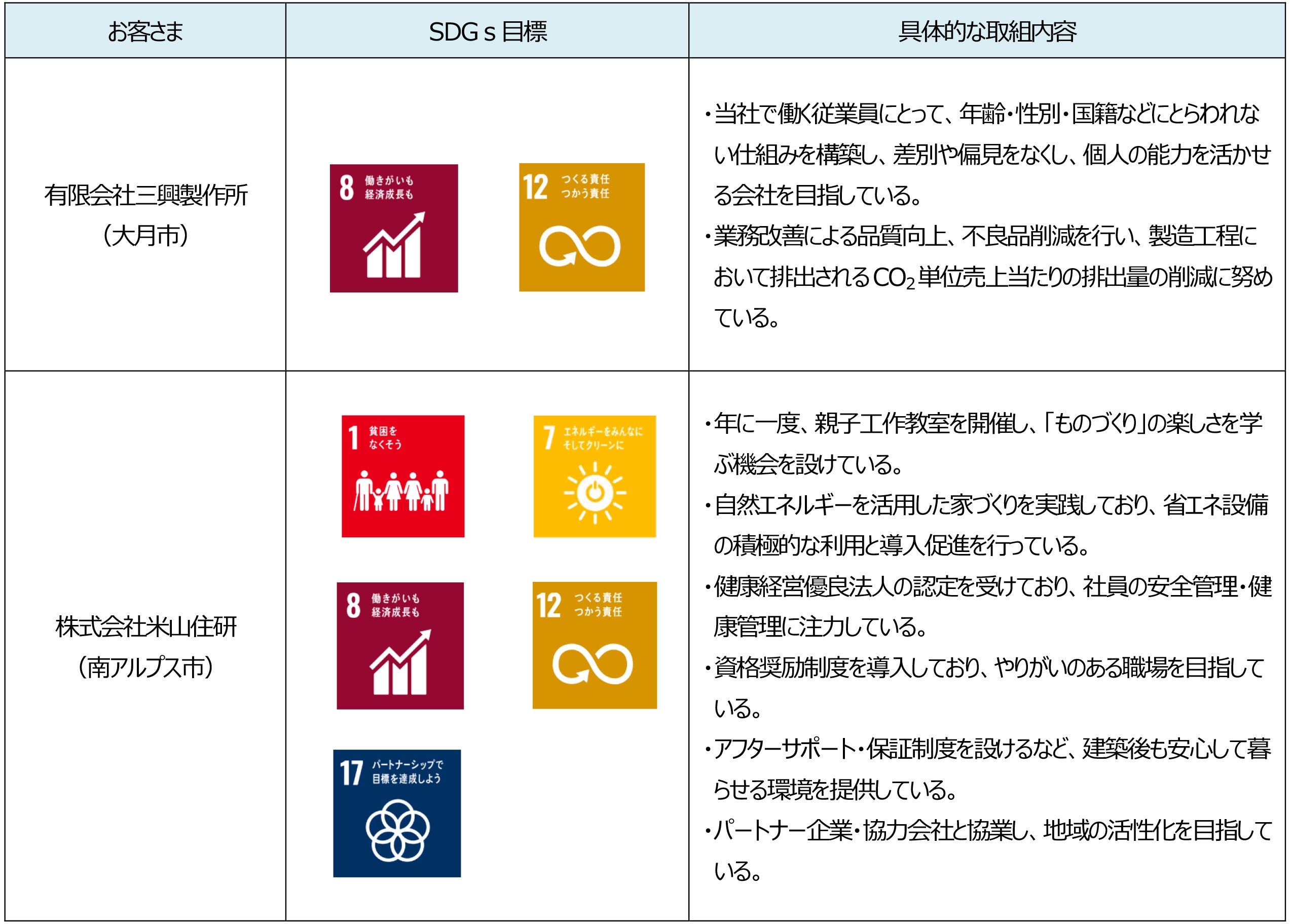 株式会社山梨中央銀行(頭取 古屋 賀章)は、SDGsの目標達成に資する取組みを積極的に行っているお客さまにご利用いただける「山梨中銀SDGs応援ローン」を、2025年12月中に2件実行しました。 当行は、本商品の提供により、お客さまの多様な資金調達ニーズにお応えするとともに、持続可能な地域社会づくりや地域貢献活動を積極的に支援してまいります。 <本商品を実行したお客さま(五十音順)>
