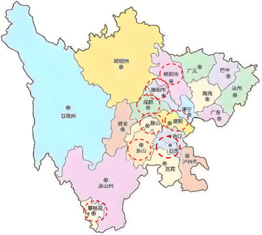 <四川省各都市>※赤丸が今回のテスト地域