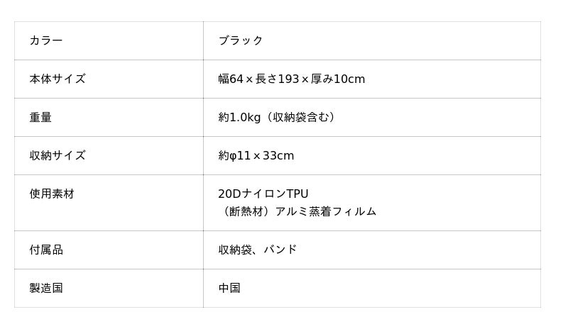 内部には、三層の両面アルミ蒸着フィルムをTPUフィルムで重ねることで、高い断熱性を実現しています。快適な使用サイズとコンパクト収納を維持しながら、可能な限り断熱性を高めるために、断熱フィルムを3層に重ねています。軽量化だけを考えると断熱フィルムは無い方が良いですが、「高断熱」「快適サイズ」「コンパクト収納」を目指し、重さを多少犠牲にしつつもバランスをとれるように設計して商品化いたしました。また、軽くするために生地は20Dナイロンを選んでおります。