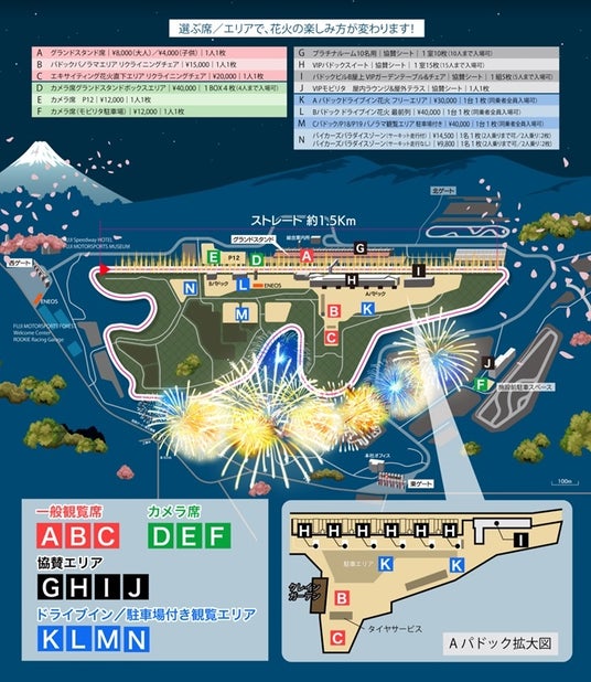 今回の「富士山花火vsスピードウェイ2026」のチケットは、「グランドスタンド席」をはじめ、ご家族やグループでお得にお楽しみいただける「ドライブイン席」、花火の迫力を間近にご覧いたける「リクライニングチェア席」、花火撮影に最適な視界とスペースを確保した「カメラ席」など、さまざまな種類をご用意しました。観覧スタイルもさまざま。富士山を望む春のサーキットで、自分らしい花火の楽しみ方を選んでいただけます。