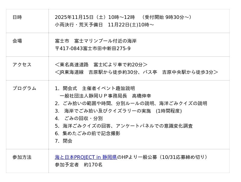 一般社団法人静岡UPは2025年11月15日(土)10時~ (※荒天予備日11月22日(土))に静岡お助け隊~キレイな海を守るために~ごみ拾い大作戦を富士市富士マリンプール(富士市田中新田275-9)付近の海岸で開催いたします。このイベントは、日本財団が推進する海洋ごみ対策プロジェクト「海と日本プロジェクト・CHANGE FOR THE BLUE」の一環で開催するものです。