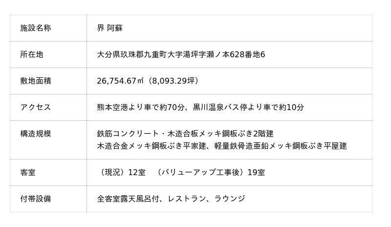 株式会社NBIホールディングス(本社:東京都港区、代表取締役:金谷 隆行、以下「NBIホールディングス」)が推進する、阿蘇黒川温泉プロジェクト(以下「阿蘇黒川温泉PJ」)および伊豆下田南楽プロジェクト(以下「伊豆下田南楽PJ」)へ、三井住友ファイナンス&リース株式会社(本社:東京都千代田区、代表取締役社長:今枝 哲郎)の戦略子会社であるSMFLみらいパートナーズ株式会社(本社:東京都千代田区、代表取締役社長:上田 明、以下「SMFLみらいパートナーズ」)が参画したこと、並びに開業に向けた施設のバリューアップ工事を開始することをお知らせいたします。