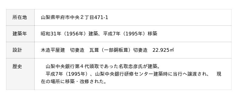 株式会社山梨中央銀行(頭取 古屋 賀章)が所有する「山梨中央銀行(旧名取家住宅)茶室水月」(以下「茶室水月」といいます)が、国の文化審議会において登録有形文化財(建造物)に登録するよう文部科学大臣に答申されました。 茶室水月は、厳選した材料により上質な茶室空間を創出している点や、地方都市に根付いた茶道文化を象徴する建物である点が高く評価されました。今後、官報告示を経て正式に登録されます。 【茶室水月の概要】