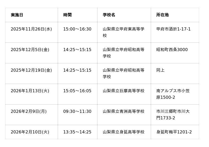 本授業は、以下の日程で山梨県内の高等学校にて実施されます。