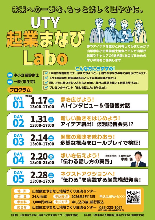 UTYと山梨県中小企業診断士協会(やまなし創業研究会)がパートナーシップを組み、未来の選択肢をさらに豊かに面白くしていく緩やかな学びの場をご提供します。プログラムは全5回。講師陣には中小企業診断士の他、UTYスゴろくニュース前キャスター小嶋優も登場します。