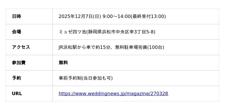 【浜松ウェディングフェスタ】参加者満足度92.3%の体験型イベント、12月7日(日)に開催決定