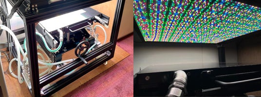LED定常光ソーラシミュレータの発光は白色光となるが(左)、光源はUVを含む複数の波長で発光するLEDが組み合わされて構成されている(右)