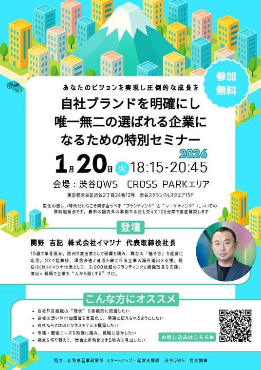 企業のブランドコンサルティング事業などを手掛ける株式会社イマジナ(本社:東京都千代田区、代表取締役社長:関野 吉記)は、2026年1月20日(火)、渋谷スクランブルスクエア(Shibuya QWS)にて、起業家・フリーランス・企業内の新規事業担当者などを対象とした特別セミナー「自社ブランドを明確にし 唯一無二の選ばれる企業になるための特別セミナー」を開催いたします。本セミナーは、山梨県産業政策部 スタートアップ・経営支援課との共催により、変化の激しい時代を生き抜くための「思考の作法」を、実践的な経営者の視点から紐解くものです。