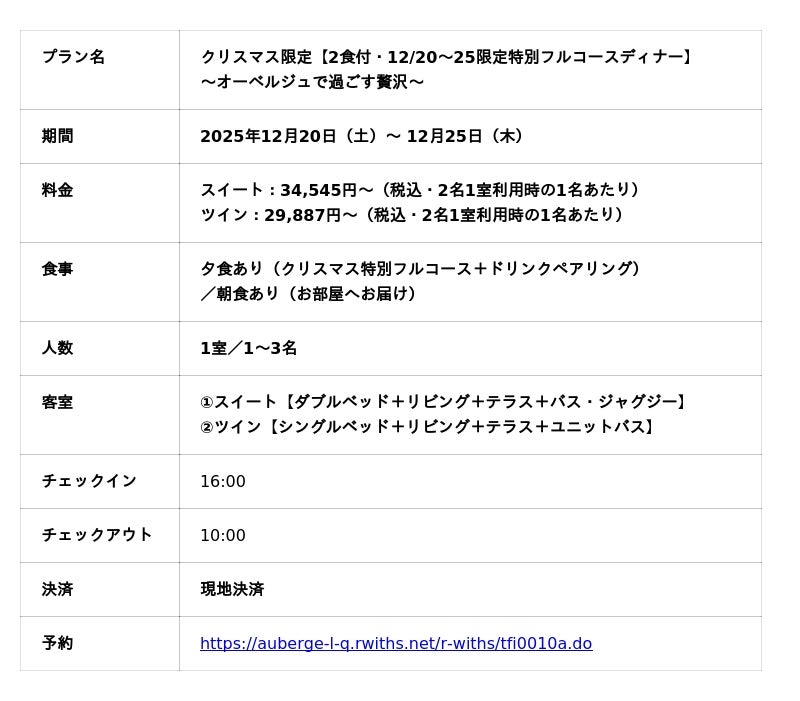静岡県浜松市でブライダル・レストラン事業を行う株式会社スティルアン(本社:静岡県浜松市中央区田町326-30、代表取締役社長:石川 学)が運営する「浜名湖オーベルジュ キャトルセゾン」は、2025年12月20日(土)~25日(木)の期間限定で、クリスマス特別宿泊プランの予約を受付中です。