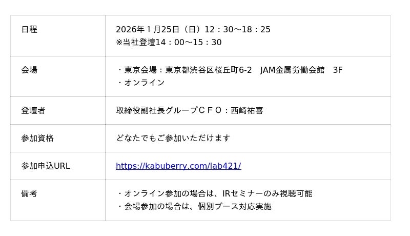 株式会社コレックホールディングス(本社:東京都豊島区、代表取締役:栗林憲介)の取締役副社長グループCFOである西崎祐喜は、2026年1月25日(日)開催の個人投資家向け参加型IRセミナー「Kabu Berry Lab」に登壇します。