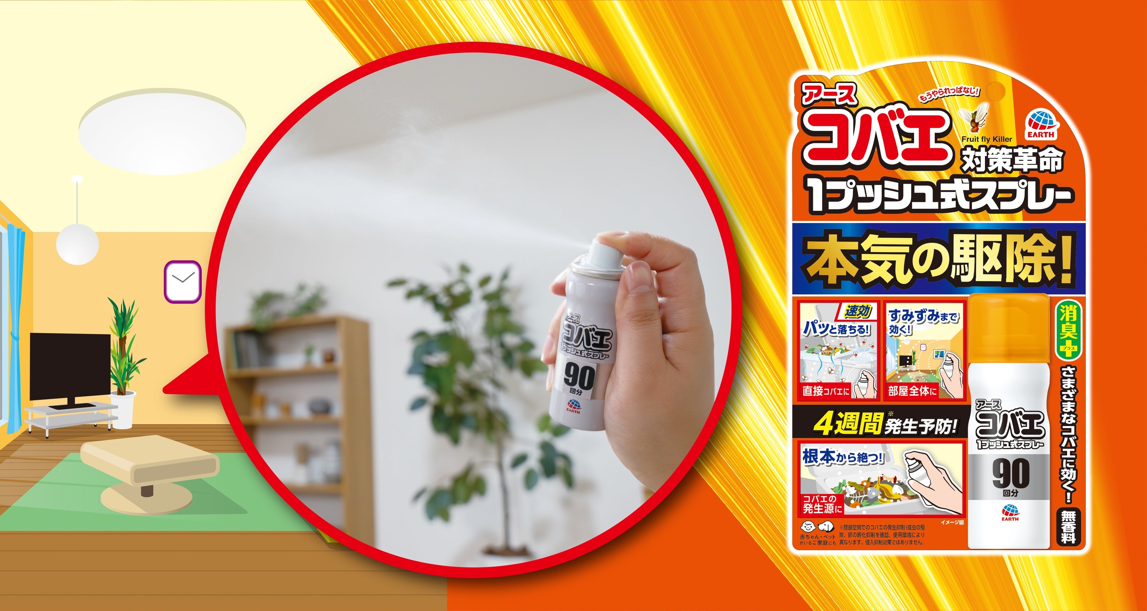 プッシュ後、薬剤が部屋に広がり飛び回るコバエを速効駆除するとともに、コバエの発生源に噴射することで、約4週間にわたりコバエの発生を予防する効果が持続します。(使用環境により異なります)