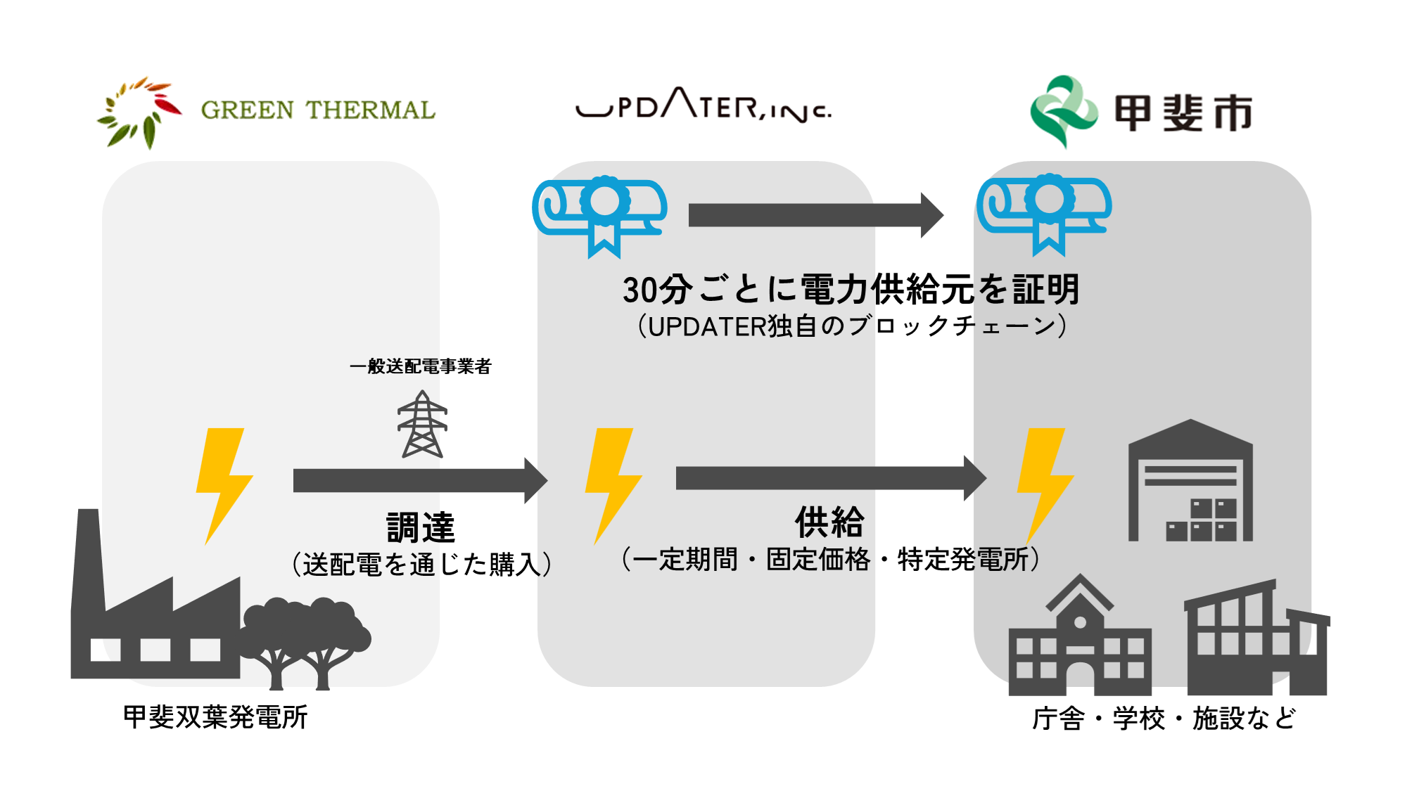 今般こうした甲斐市の取り組みとUPDATERの取り組みを掛け合わせることで、グリーン・サーマルが運営する市内のバイオマス発電所から再生可能エネルギーを公共施設に供給することとなりました。