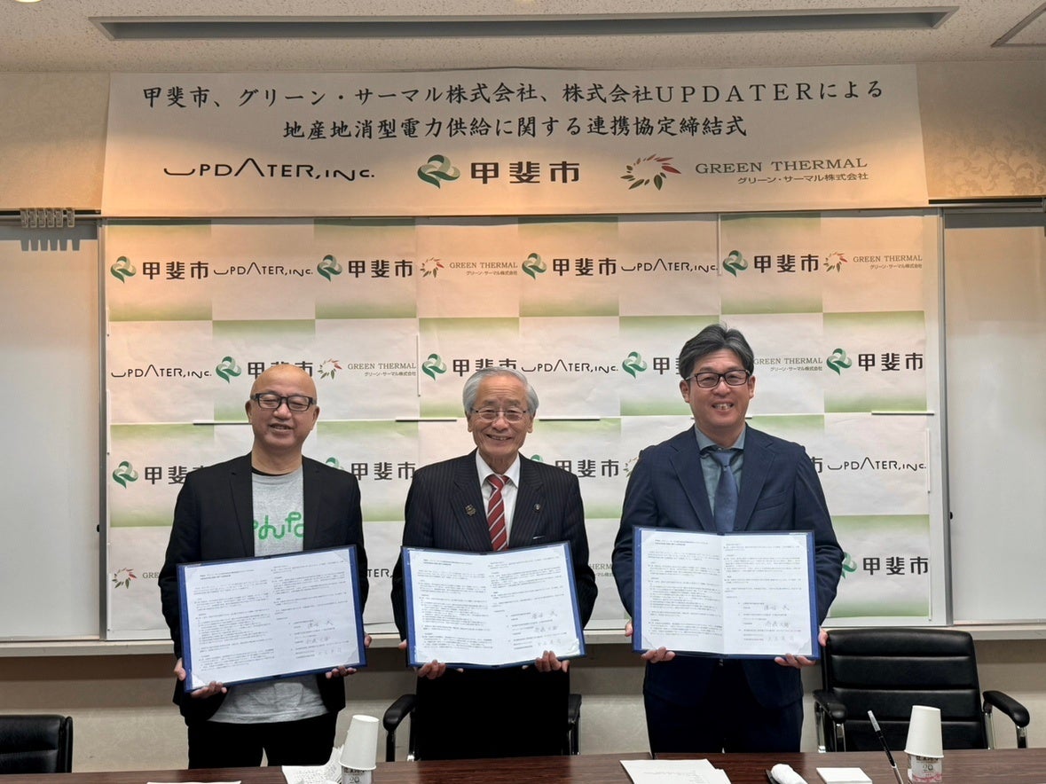 山梨県甲斐市(市長:保坂武、以下「甲斐市」)、株式会社UPDATER(本社:東京都世田谷区、代表取締役:大石英司、以下「UPDATER」)ならびにグリーン・サーマル株式会社(本社:東京都千代田区、代表取締役:齋藤大輔、以下「グリーン・サーマル」)は、2026年2月3日付で「地産地消型電力供給に関する連携協定」を締結しました。