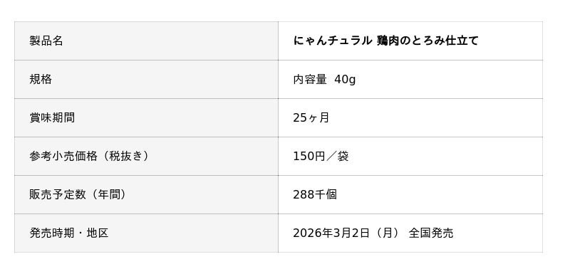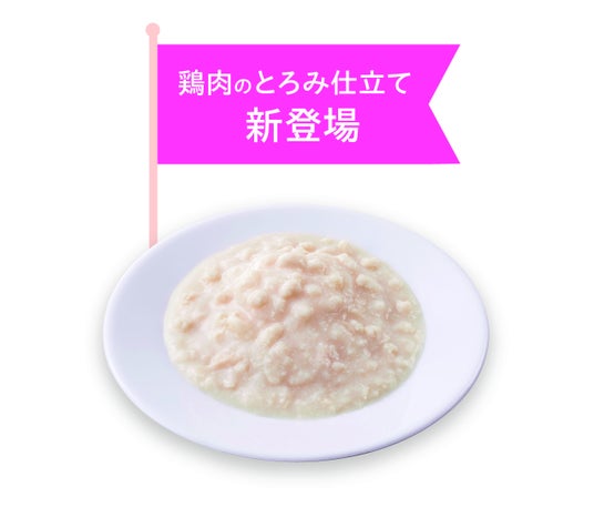 今回発売する「にゃんチュラル 鶏肉のとろみ仕立て」は、ペットフード市場でも需要が高い鶏肉のそぼろを使用し、増粘剤、調味料、着色料、発色剤不使用。チキンエキスやチーズなどを使って旨みと香りをアップし、すべての年齢層の猫ちゃんがおいしく食べられるように米粉でとろみを付け、食べやすさにこだわった仕様に仕上げました。