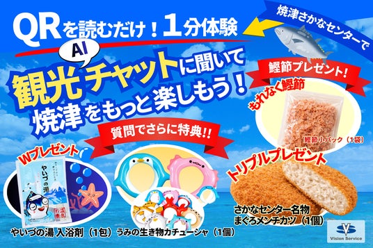 株式会社ビジョンサービス(本社:東京都港区、代表取締役:屋代英男)は、焼津市と連携し、観光AIチャットボットを実際に体験できる来場者参加型イベントを、2026年2月21日(土)に焼津さかなセンターにて開催します。
