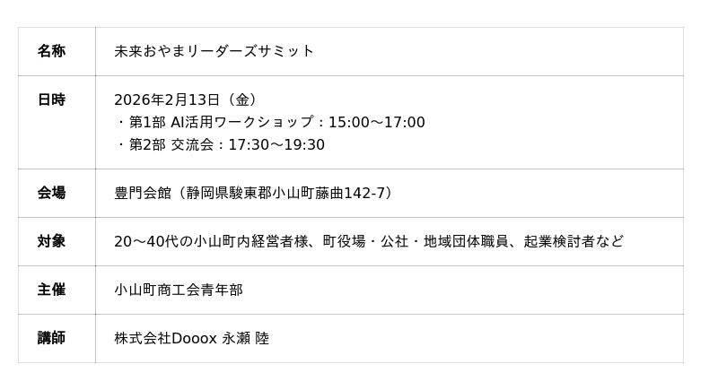 『緊急ではないけれど、重要な課題』について、企業経営者に伴走する特命社長室(R)?を展開する株式会社Dooox(本社:東京都品川区、代表:久保寺亮介/以下「当社」)は、2026年2月13日(金)、小山町の豊門会館にて、地域で働く20代~40代の若手リーダー層を対象とした生成AIワークショップを開催いたしました。当日は、全国の商工会議所等で生成AI活用ワークショップを展開する当社より永瀬陸が講師を務め、小山町から集まった経営者、町役場の職員含め、22名の皆様にご参加いただきました。