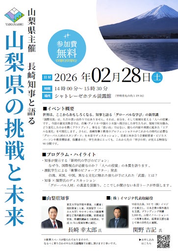 山梨県(知事:長崎幸太郎)は、2026年2月28日(土)、シャトレーゼホテル談露館(甲府市)において、次世代を担う若者と県政の未来を繋ぐ意見交換会「県政アンバサダーイベント」を開催します。