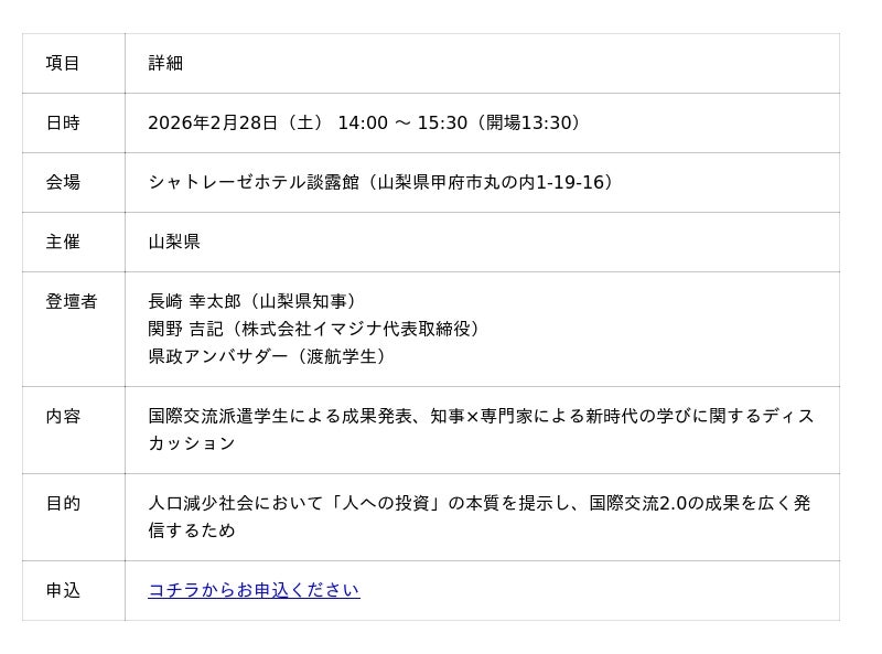 「選ばれる地域、選ばれる人」になるための戦略とは?教育、経済、そして知事が力を入れている「実質的な国際交流」が交差する、山梨県から日本全国へ向けた挑戦状とも言える90分間。特に、未来を担う若者が国際交流を通じて得た経験を、どのように自身の成長と地域のグローバル化に繋げていくのか、その若者視点での成果と提言に焦点を当てます。形式的な交流に終わらず、世界の技術や知見を取り込み、県民の生活を豊かにするための経済的交流へと深化させる山梨県の新たな挑戦にご注目ください。報道関係者の皆様におかれましては、ぜひ当日の熱気を取材いただきたく、ご案内申し上げます。