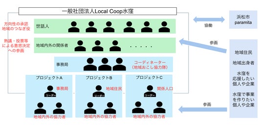 初期体制図。浜松市・paramitaと協働しながら、地域住民を中心にプロジェクトごとにチームをつくる。