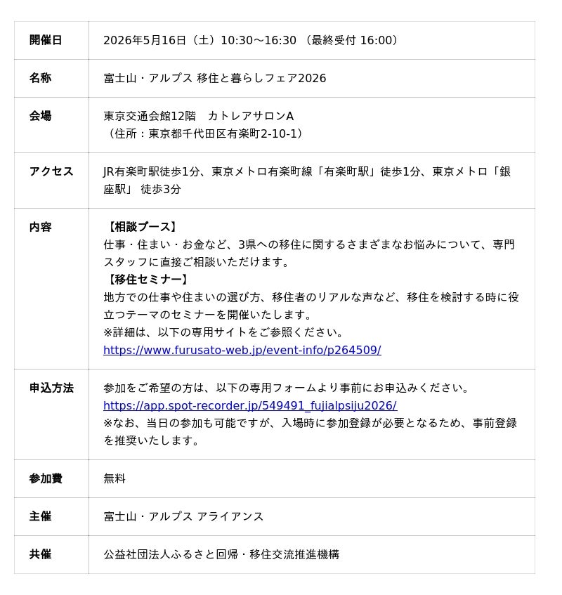 全国の自治体と連携して移住を支援する公益社団法人ふるさと回帰・移住交流推進機構(東京都千代田区、理事長 高橋 公)は、「富士山・アルプス アライアンス」と連携し、5月16日(土)に「富士山・アルプス 移住と暮らしフェア2026」を開催します。同アライアンスは、2025年3月に静岡銀行(頭取 八木 稔)、山梨中央銀行(頭取 古屋 賀章)、八十二長野銀行(頭取 松下 正樹)の3行が、包括業務提携を締結し、発足しました。